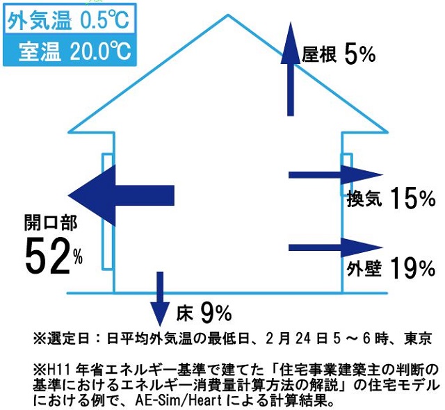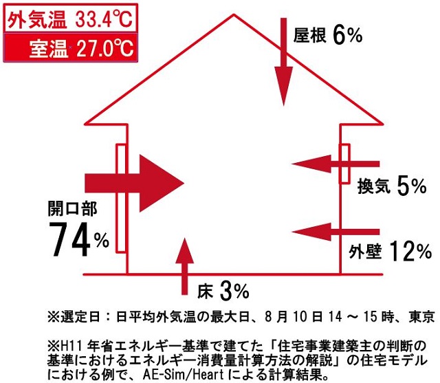 断熱とは“熱を断つ”と書きますが、断熱性は“熱をどれだけ断つか”ではないのです。実は「断熱性=熱の伝わるスピード」という意味なのです。窓においての断熱性とは、室内を冷やした空気、暖めた空気がどのくらいのスピードで外に逃げていくか、ということです。上図のように開口部からの熱の逃げる量が一番多いことが分かります。ですので、その開口部である窓を変えることで、逃げる熱の量を減らすことができます。断熱性をよくすると室内の一度温めた空気、冷たい空気が外に逃げにくくなるため、冷暖房の使用頻度を抑えることができます。その結果、光熱費の削減につながるのです。また、室温の急上昇・急低下によるストレスも軽減されるでしょう。