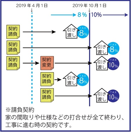 しかし、増税日の半年前である2019年3月31日までに請負契約をしていれば、建物完成が増税後であっても消費税は「8%」が適応されます。