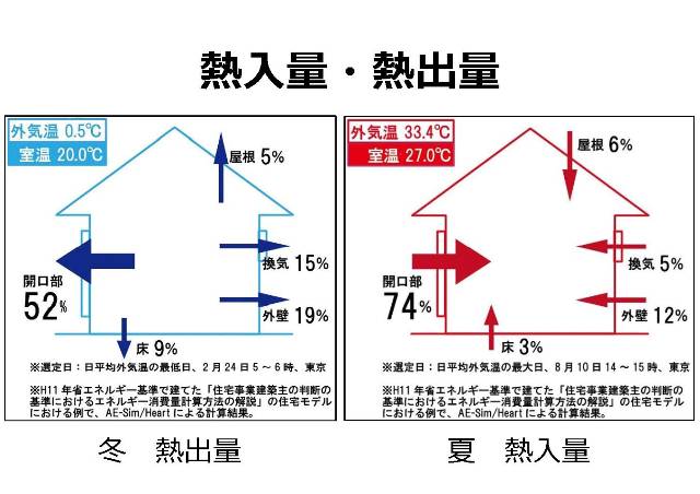 上図のように、夏・冬ともに開口部(=窓)からの熱の出入りが一番となっています。