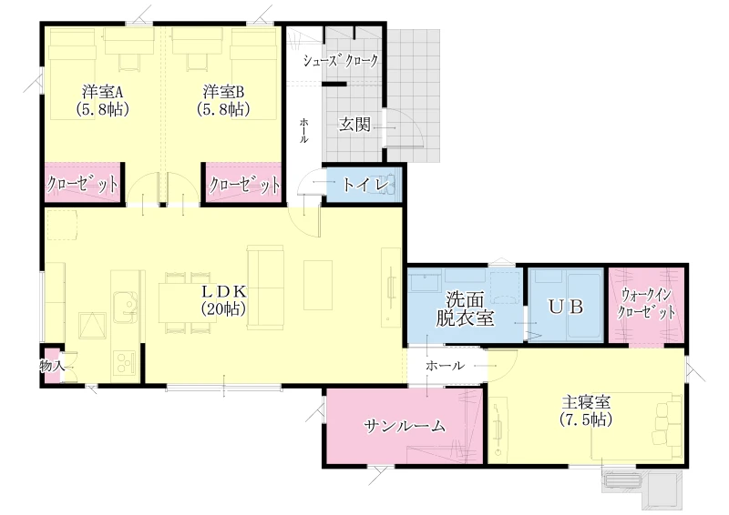 5.8帖+5.8帖の洋室は成長に合わせて2部屋に分けることもでき、ライフスタイルに柔軟に対応します。