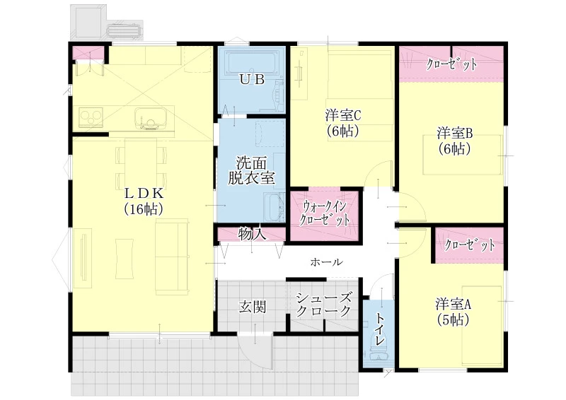 | 特徴 | 24時間換気システム、平坦地、閑静な住宅街、前道6m以上、地盤調査済、2面採光、LDK15帖以上、全居室洋室、全居室収納、外構工事費込、省令準耐火構造、ZEH仕様、制震ダンパー | ||
