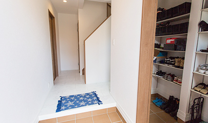 玄関に備わった大容量のシューズクロークは、表から見えない造りがポイント。玄関をいつもキレイな状態に保ってくれます。
