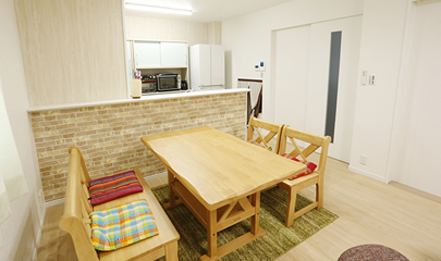 明るく開放的なLDKは、ご家族のたいせつな寛ぎ空間です。白を基調とした内装に、あたたかみのある木目調のテーブル、カーペットのグリーンの差し色が映え、とてもナチュラルで素敵。
