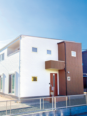 70坪の土地にゆったりと佇む、ブラウンとホワイトのバイカラーがお洒落な5LDKの新築の家。