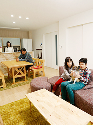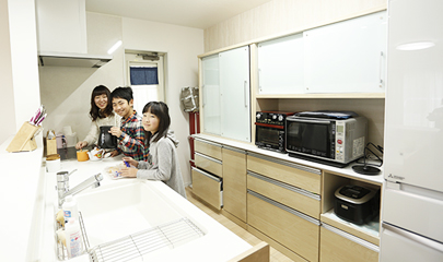 人気の対面キッチンは、毎日忙しいママの味方。炊事中もキッチンから、ご家族の姿を見れるだけでなく、リビングからの見通しが良く、ご家族とのコミュニケーションにもつながります。