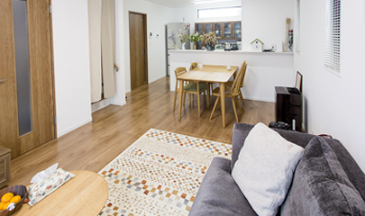 明るく開放的なLDK。キッチンは、ご家族のコミュニケーションにもつながる対面キッチンが備わっています。