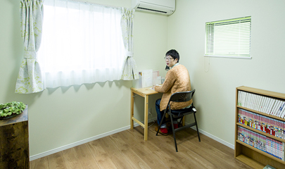 室内は、デスクに本棚などシンプルなインテリア配置がされゆったりと開放的。日当たりも抜群の居室空間で、趣味やお仕事も一層はかどりそうです。
