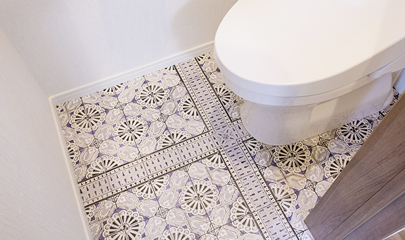 いっぽう、トイレの床はクラシカルな雰囲気が特徴的な東欧のタイル調の柄が素敵です。ご夫婦のセンスの良さとこだわりを感じます。