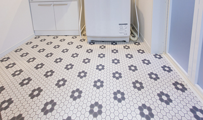 水まわりはご夫婦こだわりの快適空間です。ランドリ―の床はさりげなく可愛い六角タイル調の柄に。