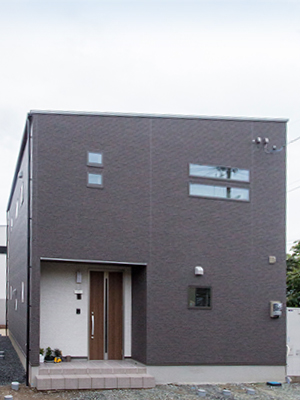 外壁は汚れが目立ちにくいダークカラーのサイディングを採用したスタイリッシュな外観の二階建て。
