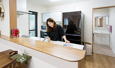 キッチンは、使いやすい対面式を採用。キッチンからは、リビングや洋室、お庭まで目が届く理想の間取りを実現しました。