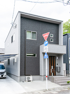 家の正面と側面でちがう表情を見せるお洒落な外観のT様邸。ハコ型でカッコイイお家になりました。