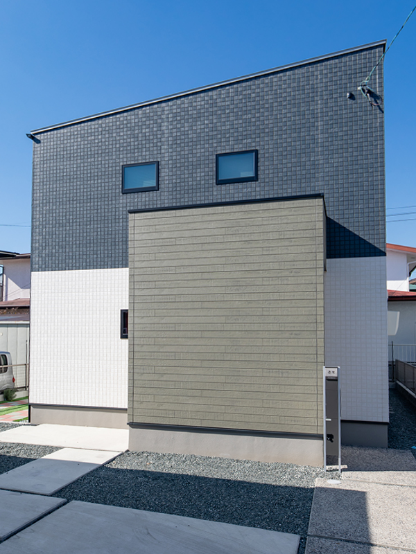 T様ご夫婦が選んだ上下2色の切り替えと、玄関を覆うカーキの壁色が素敵な外観のお家。