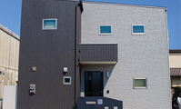 シンプルなハコ型の外観の家。広く明るい玄関は、外出時も出入りがしやすく、小さなお子さまがいるご家庭でもうれしい、こだわりポイント。